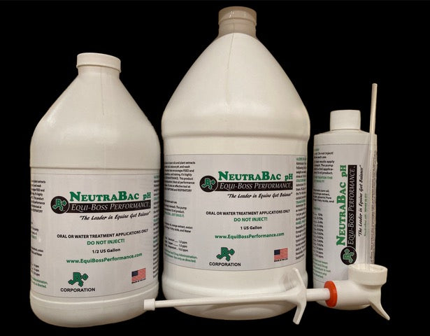 NeutraBac pH is a 100% ALL NATURAL blend of plant oils and plant extracts which aids in NEUTRA-lizing excess stomach acid, washing out harmful BAC-teria, and balancing pH during times of stress. This product also encourages FEED and WATER INTAKE during rigorous transportation, competition, and training. It's highly effective at reducing ULCER SIGNS as well as ULCER MAINTENANCE. NeutraBac pH is also an effective tool at combating digestive problems as well as colic symptoms and respiratory issues.